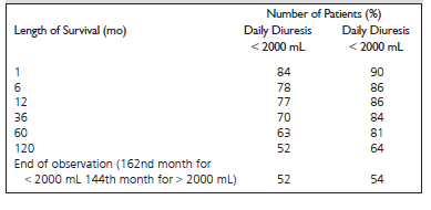 For survival analysis, patients were divided into 2 groups: patients who received kidney from donors with daily diuresis ≤ 2000 mL and > 2000 mL. Graft survival was significantly higher in the second group (P = .014; Wilcoxon-Gehan); therefore, we concluded that donor daily diuresis is a significant predictor of transplant survival. We also found that volume of donor daily diuresis was correlated with recipient sodium level (Pearson k = 0.147; P = .036). However, we did not observe any significant difference in patient survival (P = .191; Wilcoxon-Gehan). Survival rates and curves for grafts are presented in the Table 5 and Figure 1.