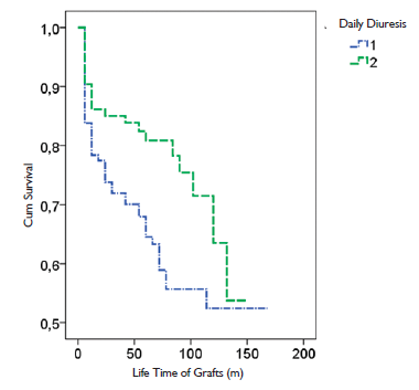 The volume of donor daily urine was significantly associated with transplant status (Kendall k = −0.117; P = .05). Our results suggest, because the coefficient is negative, that low volume of the donor daily diuresis predicts poor graft survival after surgery.
