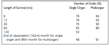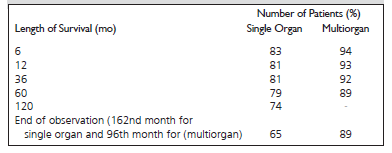Donors were divided into 2 groups, with 132 (64.4%) having single-organ explantation and 73 (35.6%) with multiorgan explantation (liver and/or heart were extracted simultaneously with kidneys). Patient and graft survival rates were significantly higher for the second group (P = .04 and P = .001; Wilcoxon-Gehan). Survival rates of patients and grafts are shown in Tables 6 and 7. The corresponding survival curves for each type of explantation are shown in Figure 2.