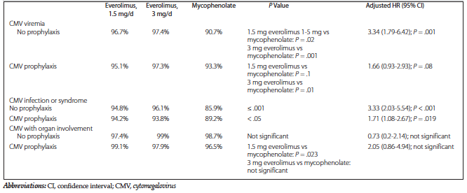 The authors found that, among recipients who did not receive CMV prophylaxis, a significantly greater proportion of kidney transplant patients who received 1.5 mg everolimus (93.5%) or 3 mg everolimus (95.5%) were free from CMV events (viremia, infections/syndrome, or disease) compared with those who received mycophenolate (85.2%; P < .001). In a Cox proportional hazards model, the adjusted hazard ratio showed that mycophenolate was associated with a significantly higher risk of CMV events (adjusted hazard ratio of 2.81; 95% confidence interval, 1.77-4.5; P < .001). Among patients who received CMV as prophylaxis, a significantly greater proportion of recipients who were given 1.5 mg everolimus (93.9%) or 3 mg everolimus (93.2%) were free from CMV events (viremia, infections/syndromes, or disease) compared with patients treated with mycophenolate. The adjusted hazard ratio from the Cox proportional hazards model for mycophenolate versus everolimus showed that mycophenolate was associated with a significantly increased risk of CMV events (adjusted hazard ratio of 1.82; 95% confidence interval, 1.18-2.8; P = .006). Table 1 shows the proportions within the 1.5-mg everolimus, 3-mg everolimus, and mycophenolate groups presenting with CMV viremia, CMV infection/syndrome, or CMV with organ involvement according to having or not having CMV prophylaxis.