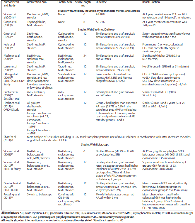 32. Rostaing L, Massari P, Garcia VD, et al. Switching from calcineurin inhibitor-based regimens to a belatacept-based regimen in renal transplant recipients: A randomized phase II study. Clin J Am Soc Nephrol. 2011;6(2):430-439.
