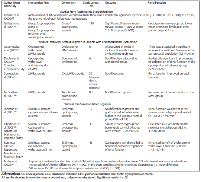 In 2001, Johnson and associates randomized renal transplant patients at 3 months to discontinue cyclosporine from their sirolimus-cyclosporine-steroid regimen, which resulted in a significantly better renal function at 12 months in the CNI withdrawal group.49