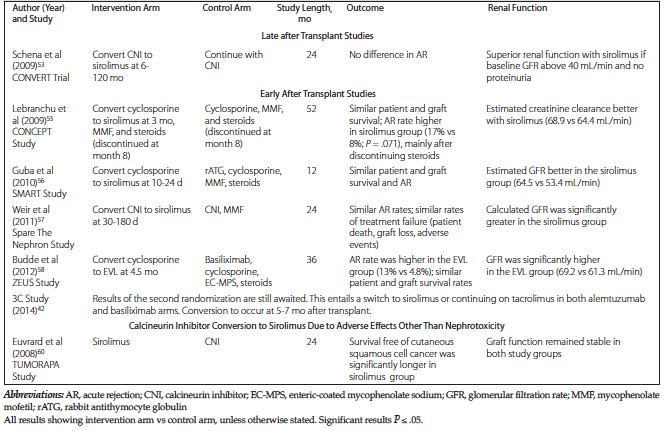 In the 2010 SMART Study, antithymocyte globulin induction therapy was used, with maintenance therapy with cyclosporine, MMF, and steroids.56 Conversion from cyclosporine to sirolimus occurred early at 10 to 24 days. After 1 year, patients who had been switched to sirolimus had higher GFR with no change in BPAR rates. At 36 months, renal function remained higher in the sirolimus group; however, more patients discontinued therapy in the sirolimus group.