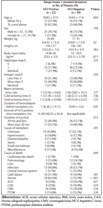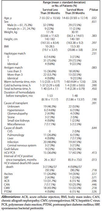 Results: Eighty-one patients were included, with median duration of survival of 39 months after transplant. In group A (32 patients), 78.1% of patients were males, with mean age of 36.83 ± 9.15 years. The mean survival duration was better in group A than in group B (67.59 ± 67.1 vs 58.10 ± 59.6 mo; P = .58). Acute cellular rejection was 25% in group A versus 20.4% in group B, whereas chronic allograft nephropathy was 20.4% for group A versus 18.4% for group B. Hepatitis C virus-related death was observed in 7 patients (21.9%). Infection was the main cause of death, with 40.6% of patients in group A versus 53% of patients in group B. On multivariate analyses, better patient survival was associated with greater interval of acquiring HCV after transplant (P = .038).