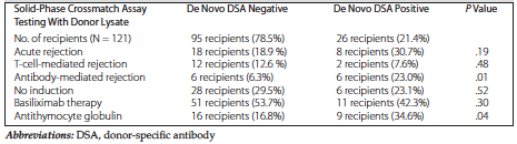Results: Of 121 recipients in our study group, 26 (21.5%) developed de novo donor-specific antibody within 3 months after transplant. Fifteen (58%) of these 26 recipients developed class II de novo donor-specific antibody, 8 patients (30%) developed class I, and 3 (12%) developed both class I and class II. Of the remaining 95 patients (79%) who did not develop de novo donor-specific antibody, 6 (33.3%) had antibody-mediated rejection with glomerulitis (2 with C4d-positive disease). Donor-specific antibody was detected by Luminex solid-phase crossmatch in 18 patients (5 with class I, 11 with class II, and 2 with both class I and II), all with no evidence of clinical rejection. Development of de novo donor-specific antibody detected by solid-phase crossmatch was associated with more acute rejection (31% in de novo donor-specific antibody-positive group versus 19% in the negative group). The positive group had more antibody-mediated rejection (75% of acute rejections), whereas only 33.3% of acute rejections in the negative group were antibody-mediated rejection. Of 12 patients with antibody-mediated rejection, 9 were C4d negative (75%) and were diagnosed by donor-specific antibody positivity detected by solid-phase cros­smatch testing and histologic findings. The use of donor lysate in solid-phase crossmatch assays is more economical than the single-antigen bead Luminex assay (per test cost of US $45.20 vs $403.20).
