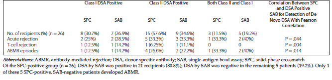 The SPC assay performed with donor lysate on Luminex platform could be useful for posttransplant de novo DSA monitoring and ABMR diagnoses and thus could serve as an estimate and indicator for diagnosis of rejection episodes (Table 2). Development of de novo DSA, as detected by SPC, was associated with significantly increased episodes of ABMR in our study (P = .01). However, DSA assay by SAB testing and negative C4d staining in renal allograft biopsy (presence of vascular injury on histology) have been the criterion standard for the diagnosis of ABMR in Banff classification.30,31