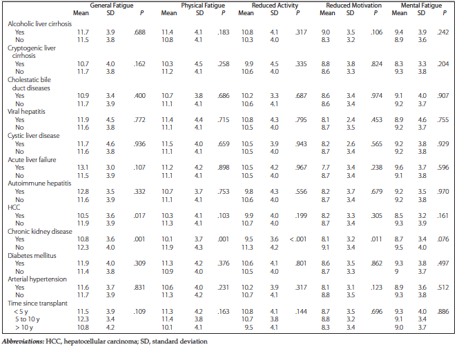 Results: Our survey included 276 eligible patients: 256 recipients (92.7%) of orthotopic liver transplant and 20 recipients (7.3%) of simultaneous/sequential liver and kidney transplant. Significantly lower fatigue scores were found in the general population compared with both transplant groups (P < .001). There were also no significant differences between the transplant groups. Among the clinical and socioeconomic factors, history of hepatocellular carcinoma, chronic kidney disease, age, family status, and education had a significant impact on fatigue levels.