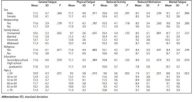 When different groups were compared regarding family status, statistically significant differences were found for physical fatigue (P = .031). Post hoc tests revealed significant differences between divorced and unmarried patients. The highest scores were found in the divorced who, compared with unmarried patients, had significantly higher scores for general fatigue (P = .004), physical fatigue (P = .002), mental fatigue (P < .021), and summation score (mean [standard deviation] of 57.5 [16.2] vs 47.7 [13.7]; P = .009).