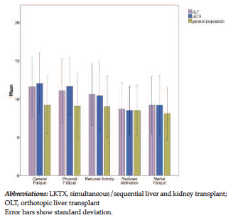 Materials and Methods: The Multidimensional Fatigue Inventory survey was sent to all patients with a history of orthotopic liver and simultaneous/sequential liver and kidney transplant. The results were compared to data from a reference population.