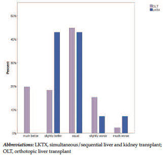 Patients who underwent LKTX showed fatigue scores higher than the general population but not higher than OLT recipients. This appears to be surprising since the overall results and outcomes of LKTX procedures are acceptable but inferior to those of patients who undergo single-organ transplant procedures.38,39 Thus, the fatigue scores found in the present study do not mirror the physical challenge that is represented by a double-organ transplant. However, almost 20% of patients from the OLT group stated that their health status had improved, whereas there were no patients from the LKTX group who marked a response of healthier than the year before. This finding potentially shows the negative effect of combined liver and kidney transplant procedures on general health status. It is also probable that the underlying renal disease in LKTX patients has a negative influence on fatigue and general health. Kirchner and associates demonstrated that fatigue is reduced significantly in patients with polycystic liver and kidney disease after transplant.24