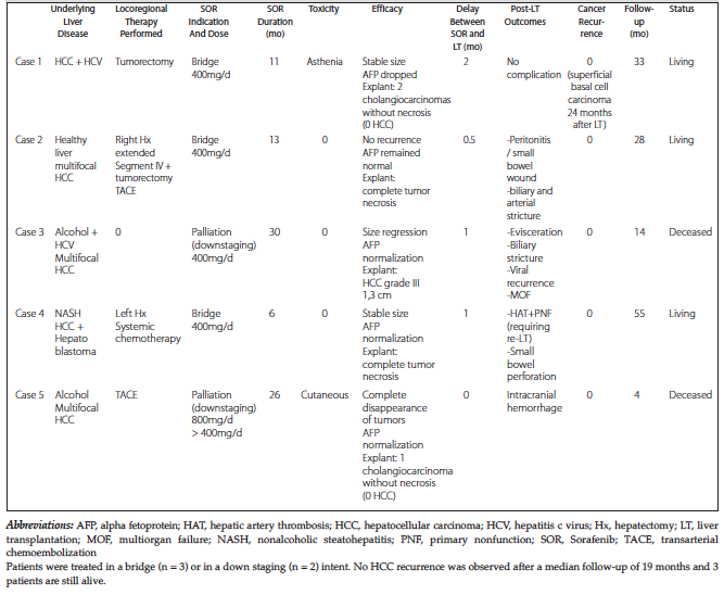 Results: Five patients were included. The daily sorafenib dose was 400 mg for a mean duration of 17 months before liver transplantation, and was found to be safe (1 severe asthenia). Three patients received sorafenib as bridge therapy after achieving stable tumor disease within the Milan criteria through transarterial chemoembolization or hepatectomy. None patient displayed any living hepatocellular carcinoma tissue after histological examination. The two remaining patients were treated with sorafenib for palliative purposes, and became eligible for transplant after down staging. No tumor recurrence was observed during the 27-month mean follow-up, whereas 2 patients died (multiorgan dysfunction and cerebral hemorrhage). Post-liver transplantation morbidity attributable to sorafenib was mild and secondary to scarring issues: biliary stenosis (n = 2) and evisceration (n = 1).