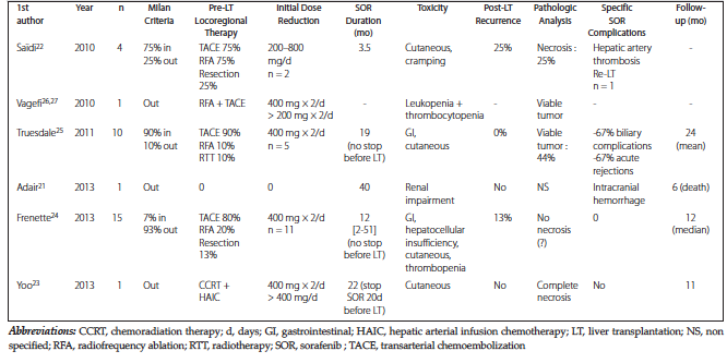 Objectives: Neoadjuvant therapies before liver transplantation are a common practice in the management of hepatocellular carcinoma, either in the setting of down staging or as a bridge strategy but sorafenib has been little evaluated.