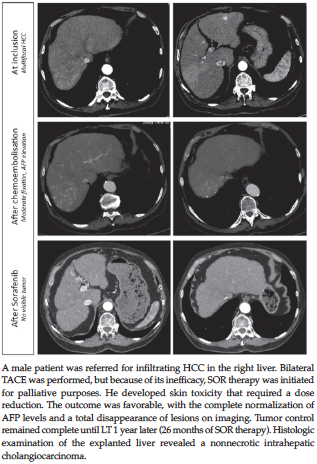 Sorafenib has been little evaluated for HCC in the LT setting, and because of this lack of controlled trials and proof of principle, no recommendations for its neoadjuvant or adjuvant use have yet been issued.10,20 We report herein on our experience regarding 5 patients who were treated with SOR before LT, either as a bridge or as a tumor down staging strategy.