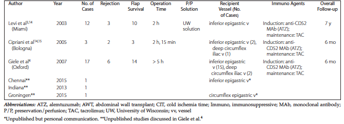 To date, there are few publications on the use of abdominal wall transplant (AWT) as a means for large abdominal wall composite defect reconstruction. Since Levi and associates first introduced AWT, there have been 35 cases of abdominal wall allotransplants worldwide, with 88% having flap survival (Table 1).3-5 Although vascularized AWT has been used in a limited number of centers, over time it has affected transplant surgery and may now be adapted for use in other fields.