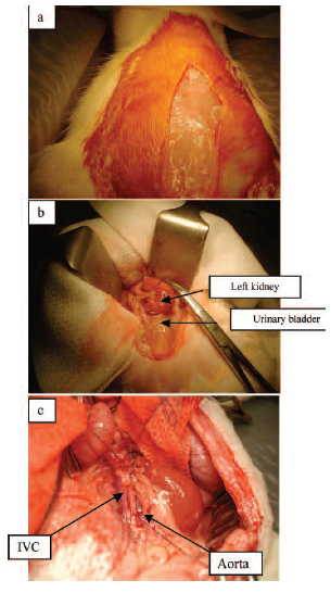 Figure 1. Steps of Dissection Showing Incision on Abdomen (a), Kidney and Urinary Bladder Mobilized (b), and Aorta and Inferior Vena Cava (IVC) Skeletonized and Held in Slings (c)