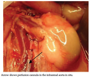 The success of RT is dependent on the quality of the harvested kidney. During donor nephrectomy, the perfusion of the donor kidney with cold preservation fluid is important for clearance of blood from the kidney and reduction of ischemia-reperfusion injury. The operating time must be kept as short as possible in both donor and recipient rats to avoid hemodynamic instability that can result from prolonged anesthetic time, blood loss, hypothermia, and dehydration from exposure of the viscera to the atmosphere.10 In human transplant procedures, the hemodynamics of the donors and recipients are maintained by close monitoring and administration of inotropes and fluids, which is not done in rats.