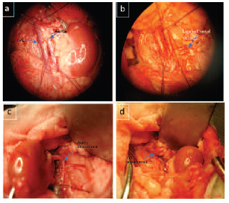 Figure 5. Retroperitoneum Showing Inferior Vena Cava (IVC), Aorta, and Left Kidney (a), After Left Nephrectomy (b), Anastomosis of the Donor Aortic Conduit and Recipient Aorta (c), and Anastomosis of the Donor IVC Conduit and Recipient IVC (d)
