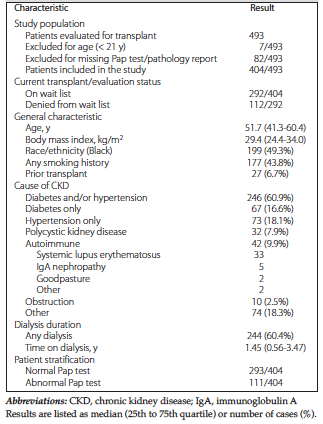 This study has limitations. This is a retrospective study of a population limited to CKD patients undergoing pretransplant evaluation at a single institution; therefore, our results may not be generalizable to CKD patients as a whole. Patients who are not referred for pretransplant evaluation are more likely to be older, have more comorbidities, or have fewer health care resources. Patients who had previously undergone cervical cancer screening as part of general health maintenance and had significant abnormal findings may not have been referred for evaluation as aggressively. A significant number of patients were also excluded from the study due to missing cytology reports (82 of 493), and many of these patients had history of hysterectomy; thus, there may not be randomness to these missing data. Patients may have had a number of cervical cancer screening events before the evaluation that were not available for analyses. Because these studies were not always available, reporting bias may be present. Some of these patients may have actually had abnormal Pap tests but did not report these results for transplant evaluation. Furthermore, because many of these studies were done externally, reporting of HPV findings varied, limiting the meaningful analysis of the role of HPV subtypes. Our study found that patients with potential exposure to immunosup-pressive therapy (those with prior transplant or autoimmune disease) had a greater risk of abnormal Pap test results, but we did not have sufficient data to explore whether patients were indeed exposed before their transplant evaluation.