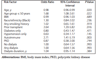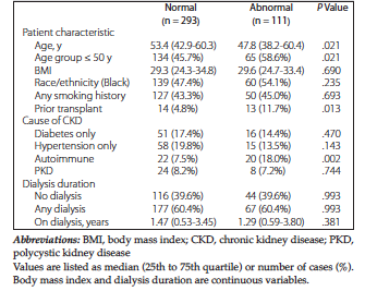 Results: Of 404 patients, 293 patients (72.5%) had normal cytologic findings, whereas 111 (27.5%) had abnormal findings. On univariate logistic regression analyses, patients who had chronic kidney disease with an autoimmune cause (odds ratio = 2.71 [95% confidence interval, 1.41-5.19]; P = .003), previous renal transplants (odds ratio = 2.64 [95% confidence interval, 1.20-5.82], P = .016), or age ≤ 50 years (odds ratio = 1.68 [95% confidence interval, 1.08-2.61], P = .022) were more likely to have abnormal findings. Patients with normal and abnormal findings had similar rates of dialysis use. On multivariate logistic regression, patients who had chronic kidney disease with autoimmune causes (odds ratio = 2.48 [95% confidence interval, 1.26-4.88]; P = .008) and who had previous renal transplants (odds ratio = 2.67 [95% confidence interval, 1.20-5.95]; P = .017) were more likely to have abnormal findings.