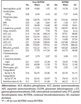 According to the International Statistical Classification of Diseases and Related Health Problems, the most frequent underlying liver diseases were fibrosis and cirrhosis of the liver (n = 121), alcoholic liver disease (n = 47), other diseases of the biliary tract (n = 47), malignant neoplasm of liver and intrahepatic bile ducts (n = 37), and hepatic failure, not elsewhere classified (n = 35). Calculation of Model for End-Stage Liver Disease scores resulted in mean values of 18.2 ± 9.1 and 18.2 ± 8.4 for patients with and without ROTEM monitoring (P > .05).