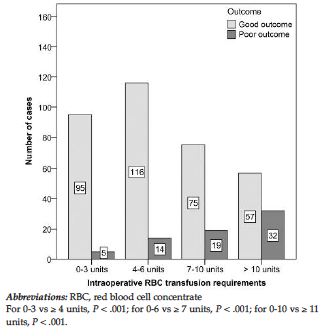Mean intraoperative blood product consumption was 8.1 ± 8.1 RBC units, 9.5 ± 7.4