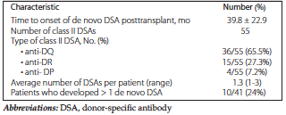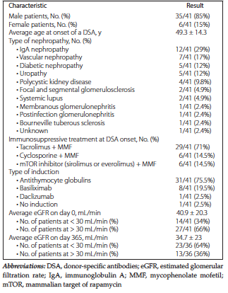 Most patients (75.5%) received an induction therapy of antilymphocyte globulins at the time of transplant. When de novo DSAs were first detected, 71% of patients had an immunosuppression protocol that included tacrolimus and mycophenolate mofetil.
