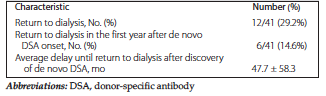 Of the 12 patients (29.2%) who returned to dialysis, 6 (14.6%) needed dialysis within the first year after DSA onset. Dialysis started at an average of 47.7 ± 58.3 months after a DSA was detected (Table 3).