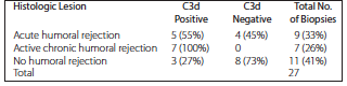 We found a significant correlation between the positivity of the C3d test and the presence of active chronic humoral rejection (P = .004). This correlation did not significantly diagnose an acute humoral rejection (P = .2) (Table 4).