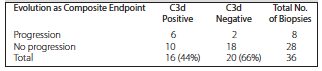 The C3d test results were significantly associated with graft survival according to our composite endpoint (P = .04, chi-squared test). The C3d test had a good negative predictive value of 90% but a low positive predictive value of 37.5%. The sensitivity of this test was 75% and specificity was 64%. The rate of false positives was high at 62.5% and was 15% for false negatives (Table 5, Figure 3).