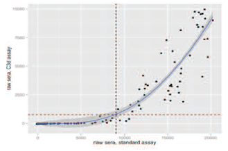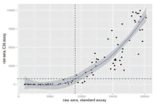 Sera were decanted, vortexed, and centrifuged. Sera were placed in wells of a filter plate, with 40 μL of beads and 10 μL of vortexed serum. The preparation was incubated for 30 minutes. A 100-μL wash and then three 250-μL washes with buffer were performed. In each well, 50 μL of conjugate, diluted to 1/5th, were added. The preparation was incubated again for 30 minutes with shaking and was then washed with 150 μL of buffer per well. The plate was then read using Luminex.