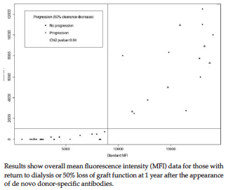 Objectives: Chronic antibody-mediated rejection is the main cause of late kidney graft loss. The presence of donor-specific antibodies in the serum is the main criterion for this diagnosis. Single antigen Luminex assays can identify donor-specific antibodies, and semiquantitative estimates of antibodies can be assessed using mean fluorescence intensity. Recent data have shown that patients whose donor-specific antibodies fix C3d have worse clinical outcomes, implying that C3d-specific Luminex assays may provide useful prognostic data.