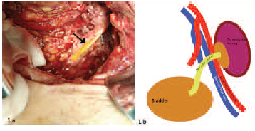 Figure 1. Fibrotic/Necrotic Ureter After Renal Transplant (black arrow; a) and Schematic Appearance of Fibrotic/Necrotic Ureter (b)