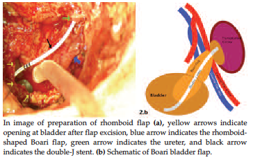 The Boari bladder flap has some advantages over the aforementioned techniques; these advantages include using only the normal urinary tract, not jeopardizing the ipsilateral renovascular unit or contralateral ureter, and the ability of performing this procedure in cases of impaired renal function, urinary stone disease, or ileal disease.5 It is a choice for ureteral reconstruction when it is not possible to mobilize the urinary bladder to the renal pelvis or to the healthy ureter or when the native ureter is not available.7