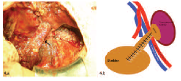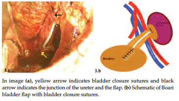 Figure 4. Appearance of Boari Bladder Flap After Completion of Procedure (black arrow; a) and Schematic (b)