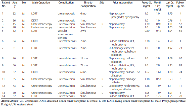 Complications after allogeneic renal transplant included ureter necrosis and anastomosis stenosis, urine leak, and vascular anastomosis stenosis. Minimally invasive management by means of either antegrade or retrograde balloon dilatation and nephrostomy was not successful. Of the 5 renal autotransplant patients, simultaneous Boari flap procedures were conducted due to ureteral avulsion during retrograde ureterorenoscopic surgery for urolithiasis (Table 1). Two of those patients had undergone laparoscopic nephrectomy, and the others received nephrectomy with open technique.