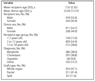 Our study included 752 patients with mean age of 90 months (range, 2-204 mo) and male-to-female ratio of 1.25 (418 male and 334 female patients). There were 354 whole organ donors (47.1%), 311 living related donors (partial graft type; 41.4%), and 87 in situ split liver allografts (11.6%).