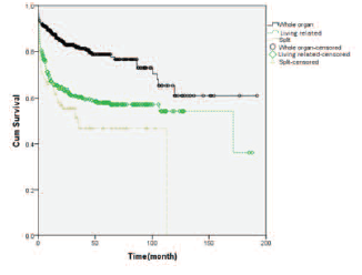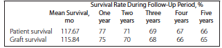 Results: Overall mortality was 31.8%. The 1-, 3-, and 5-year patient survival rates were 77%, 69%, and 66%, respectively, whereas the respective graft survival rates were 75%, 68%, and 65%. We observed significant differences in survival according to graft type (log-rank test, P < .001). We also observed significant differences in survival probabilities according to age (log-rank test, P < .001). Cox regression was used to simultaneously analyze effects of age and graft type on survival.