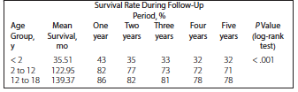 The overall 5-year survival rate in our study was 66%, which is less than that reported by most international groups. Migliazza and associates conducted a study in Spain and reported patient survival to be 80% at 1 year, 74% at 5 years, and 74% at 10 years.15 Moray and associates reported 5- and 10-year survival rates of 82.3% and 78.9%.16 At the Children’s Hospital of Pittsburgh, Jain and associates17 reported 5-year survival rate of 72%; however, the same study reported that survival rates for children greater than 2 years of age were 79.5% at 1 year, 75.7% at 5 years, and 71.6% at 10 years, results that are similar to our results. We found 1-year survival to be 82% in those between 2 and 12 years and 86% for those from 12 to 18 years old. The 5-year survival rates in these same age groups in our study were 71% and 78%, which were somewhat better. However, 1- and 5-year survival rates were better in Jain and associates17 who reported rates of 72.6% and 66.9%, respectively, for those who were less than 2 years old, whereas our results were 43% and 32% at 1 and 5 years, respectively.