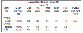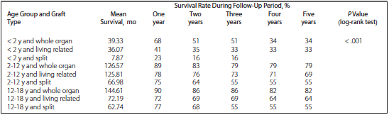 Both graft type and age significantly affected survival (P < .001). The 1-, 3, and 5-year survival rates for patients having whole organ transplants were 88%, 81%, and 78%. Patients who received living donor grafts had respective survival rates of 66%, 60%, and 58%, with rates of 65%, 47%, and 47% for patients who received split grafts.