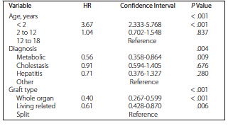 Cox regression analysis was used to consider simultaneously the effects of age, diagnosis, and graft type on survival function. We found that all factors (graft type, diagnosis, and age) significantly affected survival (P ≤ .001, P = .004, and P < .001). In a hazard ratio (HR) calculation comparing patients who received whole organ grafts versus patients who received split grafts, graft type was significant (P ≤ .001); hazard ratio was also significant for living donor grafts versus split grafts (P = .006). Regarding original diagnosis, hazard ratio was significant when we compared the metabolic diagnosis versus other diagnosis (P = .009); however, no significance in hazard ratio was shown when we compared diagnosis of cholestasis and hepatitis versus other diagnosis. In addition, hazard ratio regarding age showed significant difference in those less than 2 years old versus those who ranged from 12 to 18 years (P ≤ .001), whereas hazard ratio was not significant when we compared the 2-year to 12-year age group versus the 12-year to 18-year age group (Table 6).