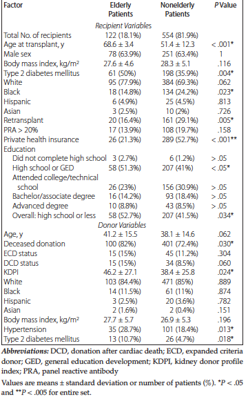 The elderly group had a significantly higher rate of transplants from deceased donors (P = .03) and a significantly higher mean KDPI (P = .024) (Table 1). Donors to the elderly population were significantly more likely to have hypertension (P = .013) and type 2 diabetes mellitus (P = .018) (Table 1). Further recipient and donor demographic data are outlined in Table 1.