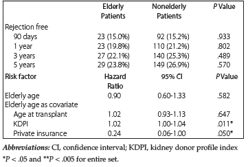 There were 29 elderly (23.8%) and 149 nonelderly (26.9%) patients who experienced rejection. We observed no significant differences in total rejection rates or interval rejection rates at 90 days, 1 year, 3 years, or 5 years (Table 3, Figure 1). Elderly age was not a significant risk factor for rejection (hazard ratio [HR] of 0.90; 95% CI, 0.6-1.33; P = .582) (Table 3). Only increased KDPI and private insurance were signi-ficant predictors of rejection (Table 3).