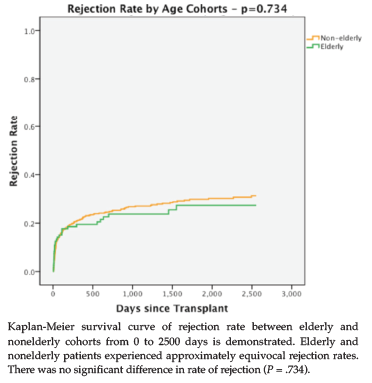 The elderly population is traditionally reported as having decreased immune function with an elevated risk of negative outcomes (eg, infection, graft loss, death) and higher likelihood of receiving a lower-quality kidney.4,5 In addition, elderly age is directly associated with more frequent allograft loss.6 Despite these claims, some have found that elderly recipients have lower rates of rejection and improved death-censored graft survival.7 Thus, current research in posttransplant management of older patients has focused on optimization of immunosuppression to achieve outcomes more comparable to outcomes shown in younger recipients.