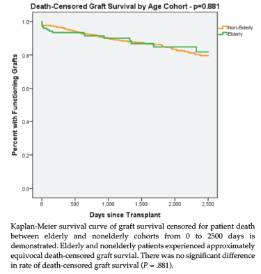 Prior reports have shown that recipients who are 65 years and older experience inferior graft and patient survival versus younger patients.17,37 In this study, we showed no differences in rate of graft survival between elderly and nonelderly patients at 90-day, 1-year, 3-year, and 5-year follow-up. We also found no differences in short-term patient survival at follow-up times of 90 days and 1 year.