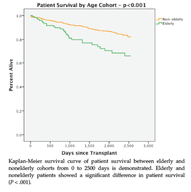 Continuous variables (eg, age, body mass index, and kidney donor profile index [KDPI]) were assessed as medians and evaluated using 2-sided t tests. For categorical variables (eg, sex, education status, insurance status, ethnicity, rejection, and DGF), we used Pearson chi-square test or Fisher exact test for analyses. Survival curves were assessed using the life table method. Factors associated with survival were identified using Cox proportional hazards regression and were assessed with elderly status as a covariate. All tests were performed at a 95% confidence interval (95% CI), and a type I error level P value of < .05 was considered significant. Patient data were reviewed using TransChart electronic medical record software (TransChart LLC, Dublin, OH, USA). Statistical analyses were performed using SPSS version 21 (IBM, Armonk, NY, USA).