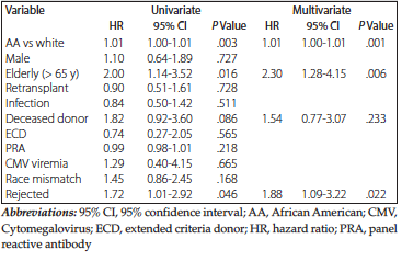 In univariate analysis, African American race/ethnicity, elderly age (> 65 years old), deceased donor, and rejection all showed P < .100 and thus were included in multivariate analysis. After multivariate analysis, only African American race/ethnicity (hazard ratio [HR] 1.01; 95% confidence interval [95% CI], 1.00-1.01; P < .001), elderly age (HR 2.30; 95% CI, 1.28-4.15; P = .006), and rejection (HR 1.88; 95% CI, 1.09-3.22; P = .022) showed significant associations with BK viremia (Table 2).