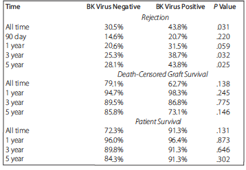 Table 3. Rejection, Death-Censored Graft Survival, and Patient Survival Outcomes in Patients With and Without BK Virus Infection