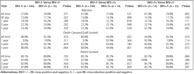 Table 4. Rejection, Death-Censored Graft Survival, and Patient Survival Outcomes in Patients With and Without BK Virus and Non-BK Virus Infections