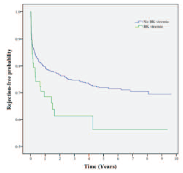 Figure 1. Kaplan-Meier Survival Analysis for Rejection in Patients With and Without BK Viremia (P = .031)