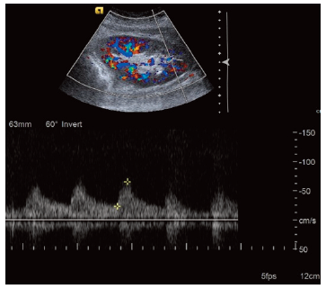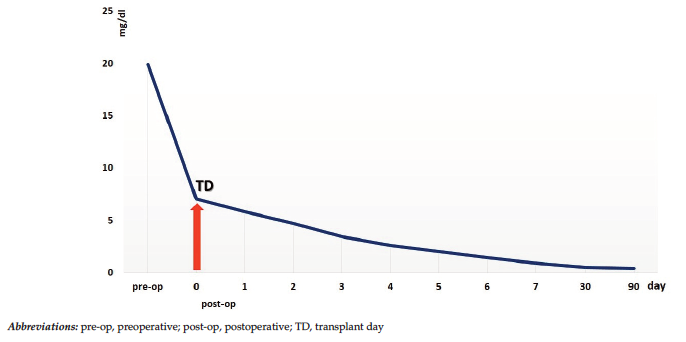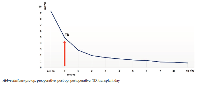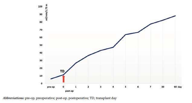 The cause of chronic kidney disease (CKD) in 9 of 38 kidney recipients was hypertension. The other etiologies were vesicoureteral reflux (n = 5), type 2 diabetes mellitus (n = 4), unknown (n = 3), polycystic kidney disease (n = 2), focal segmental glomerulosclerosis (n = 2), membranoproliferative glomerulonephritis (n = 2), nephronophthisis (n = 2), cystinosis (n = 2), and other (gout, oxalosis, nephrotic syndrome, Fabry disease, immunoglobulin A nephropathy, drug-induced nephrotoxicity, neuro­genic bladder) (n = 6). All recipients were treated in a COVID-19 transplant facility after transplant surgery. Doppler ultrasonography was performed on kidney recipients on days 3 and 5 after transplant surgery, and all results were completely normal (Figure 1). The average length of hospital stay was 8.1 days (range, 3-18 days) (Table 1). Mean serum creatinine values of the KT recipients were 0.91 mg/dL at post-operative day 7, 0.86 mg/dL at day 30, and 0.74 mg/dL at day 90 (Figure 2). Mean glomerular filtration rates were 77.2 mL/min/1.73 m2 at post-operative day 7, 82.4 mL/min/1.73 m2 at day 30, and 88 mL/min/1.73 m2 at day 90 (Figure 3). All KT recipients were discharged successfully with normal kidney functions.